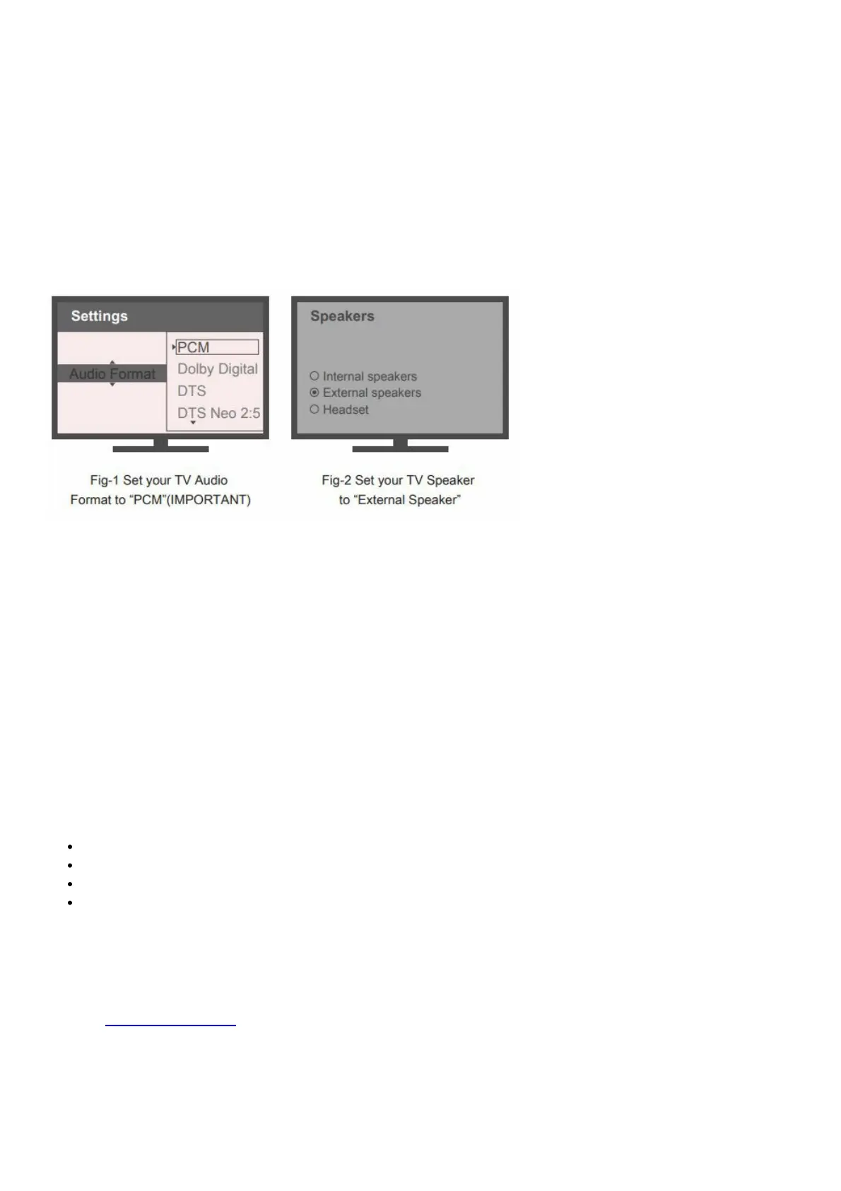 Note: Need to make sure TV audio format is set to PCM(Fig-1) and TV sound out as “External Speakers”(Fig-2)