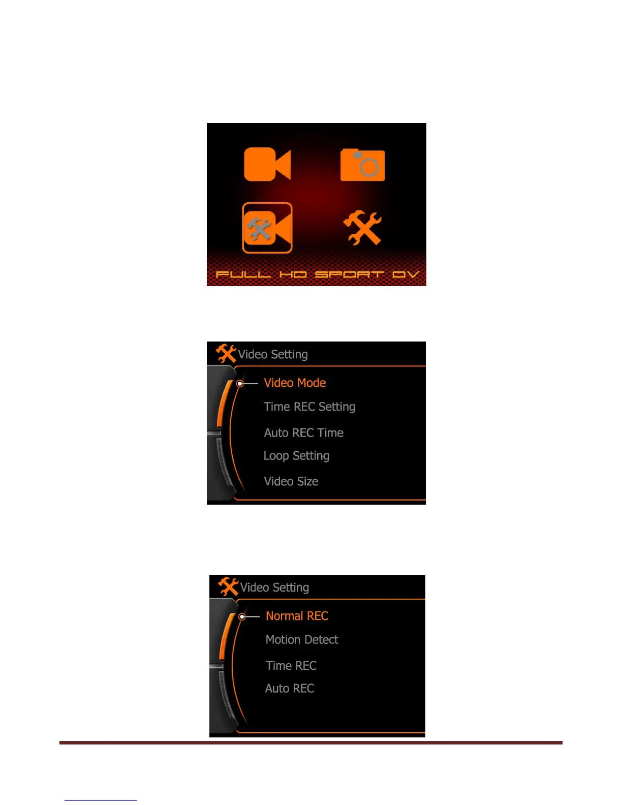 Press MENU button enter the main menu, and select the Record setting menu as below, press REC button