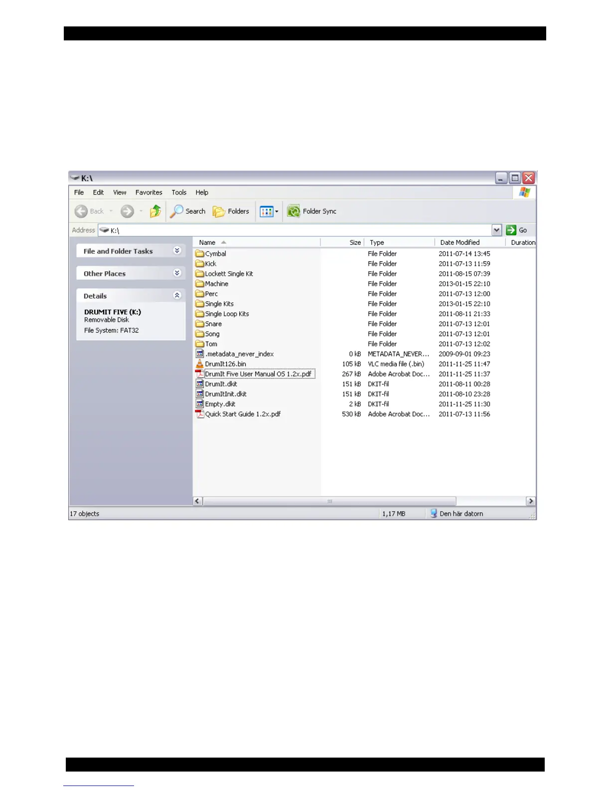 The folders of the DrumIt Five can contain both sound files and KIT files (see screenshots below).