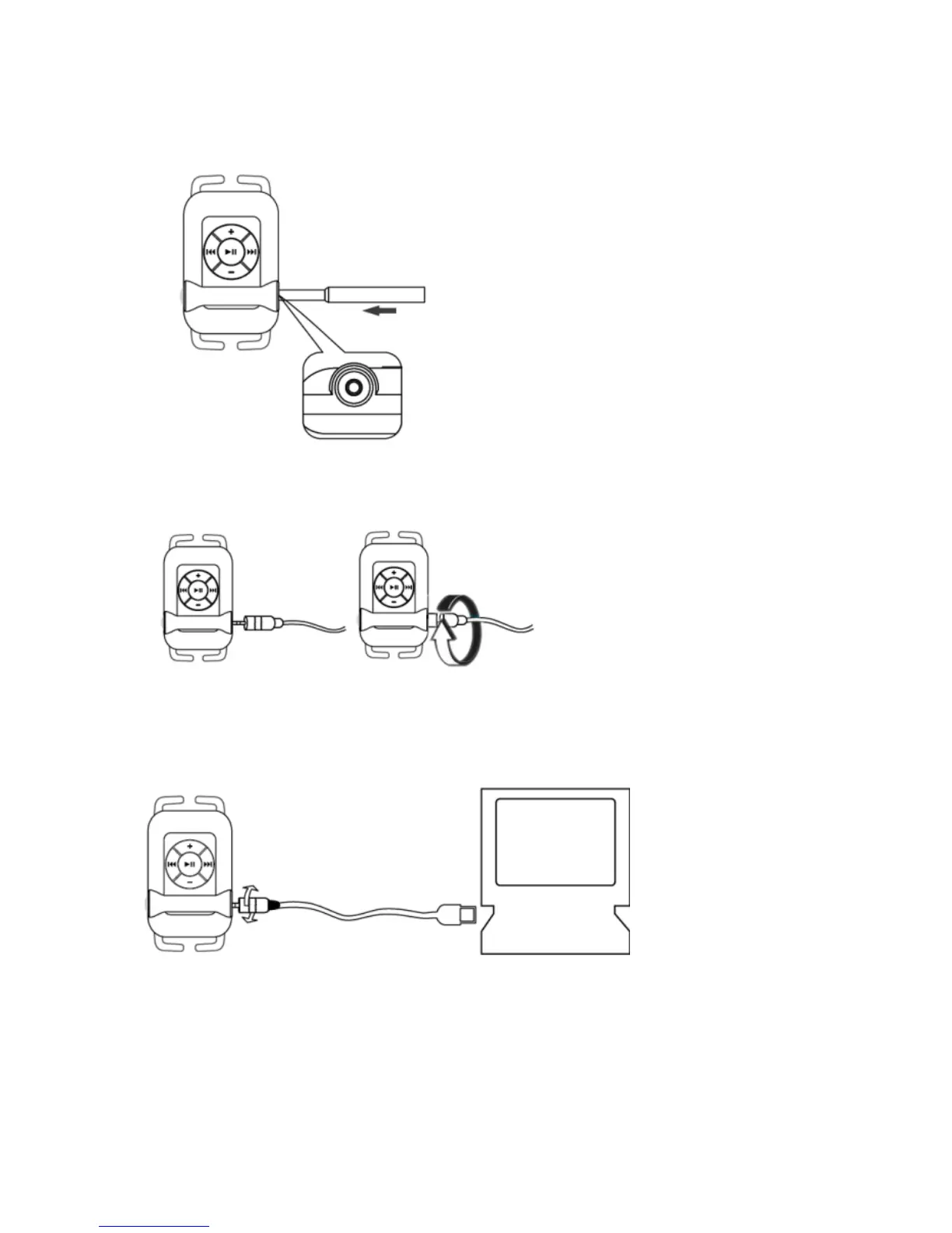 Connect the USB Cable to the MP3 Player as shown. Make