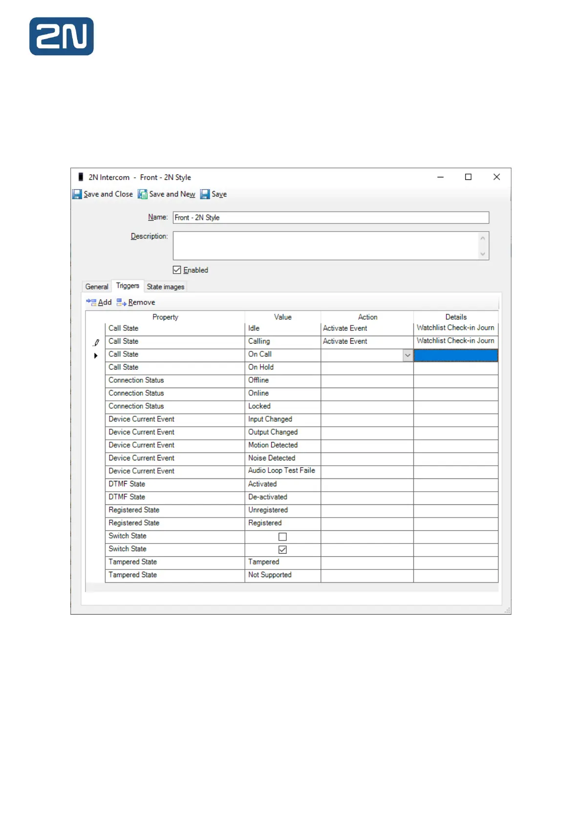 The Triggers tab is used to configure actions generated in 2N Intercoms to trigger events in C•CURE.