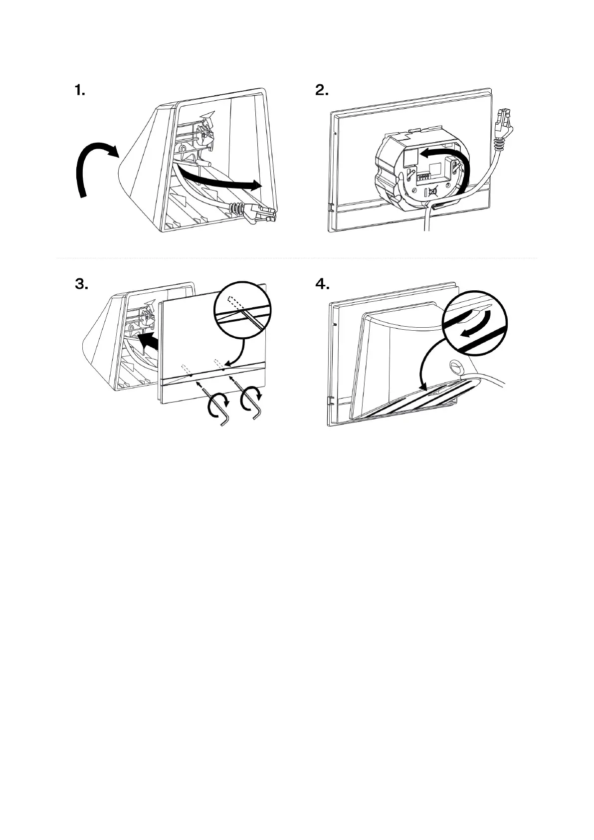 Install the cables carefully into the pre-prepared groove on the back side so that they cannot get in the