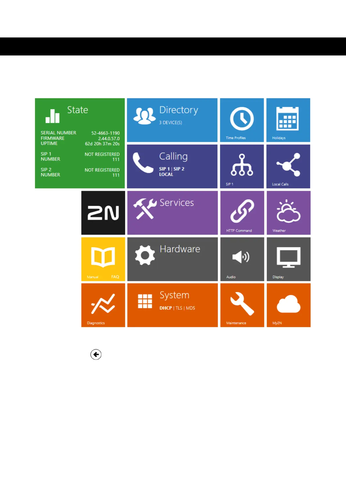 The start screen is also the first menu level and quick navigation (click on a tile) to selected