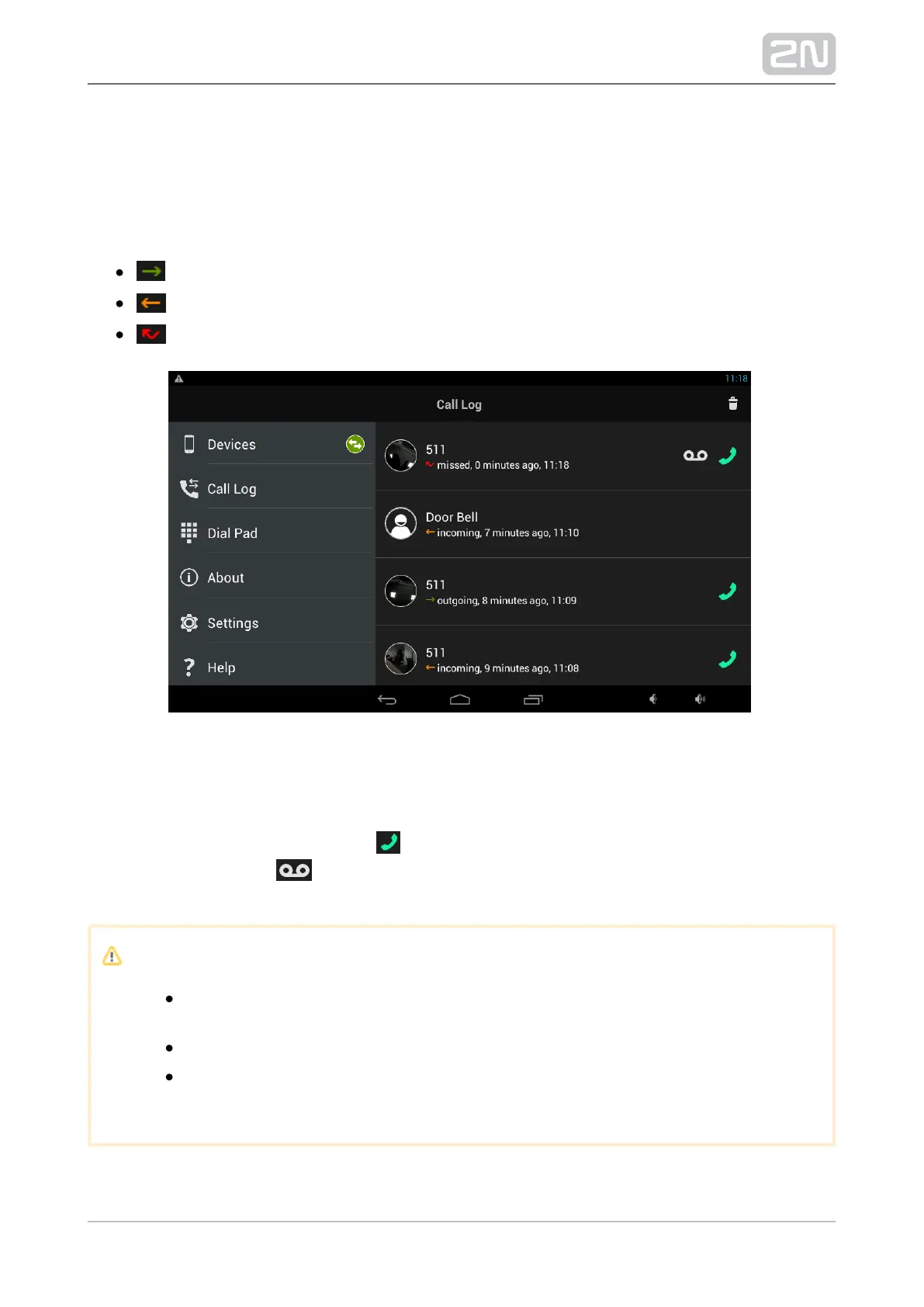 The Call Log section displays the outgoing/incoming call logs. 2N Helios IP Mobile