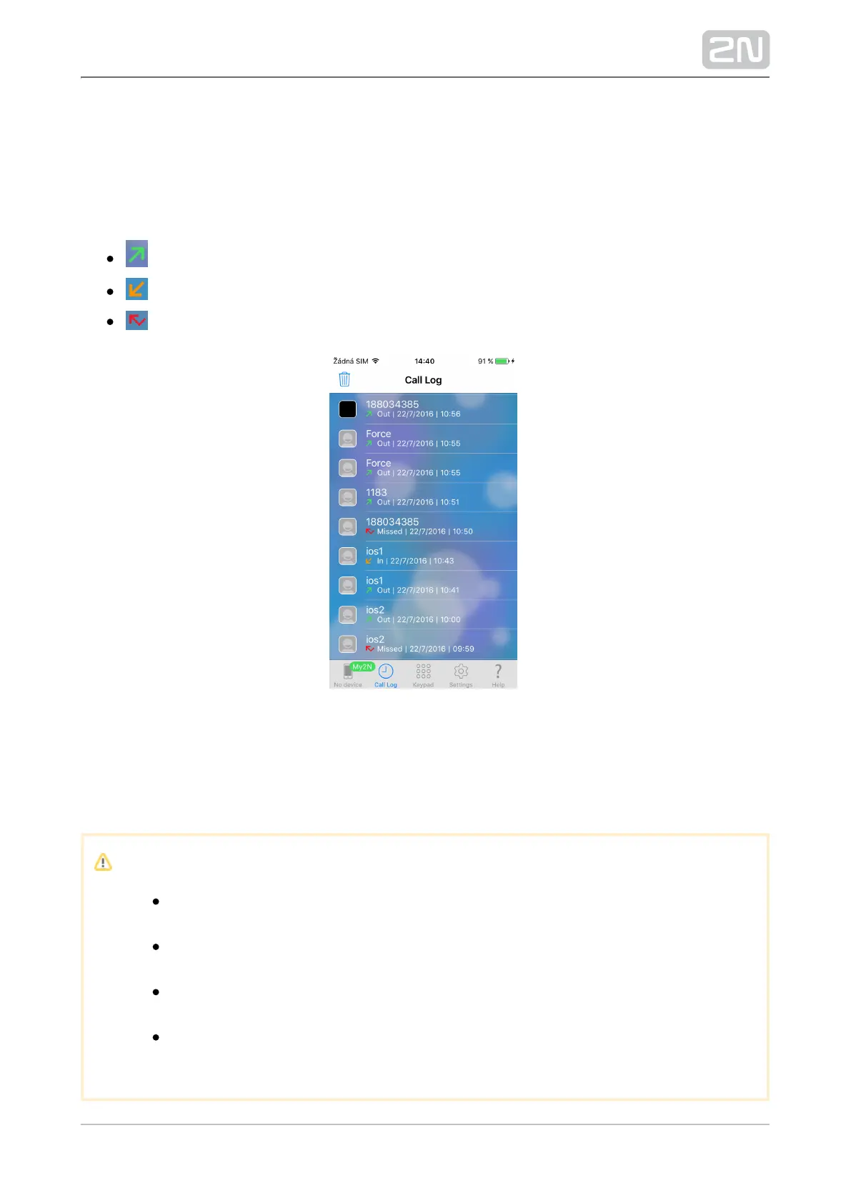 The Call Log section of the application helps you display the 2N Helios IP Mobile