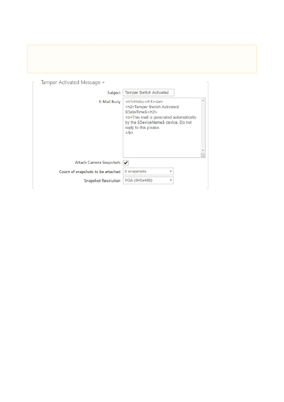 Tamper Activated Message –set the message to be sent to the specified e-mail address