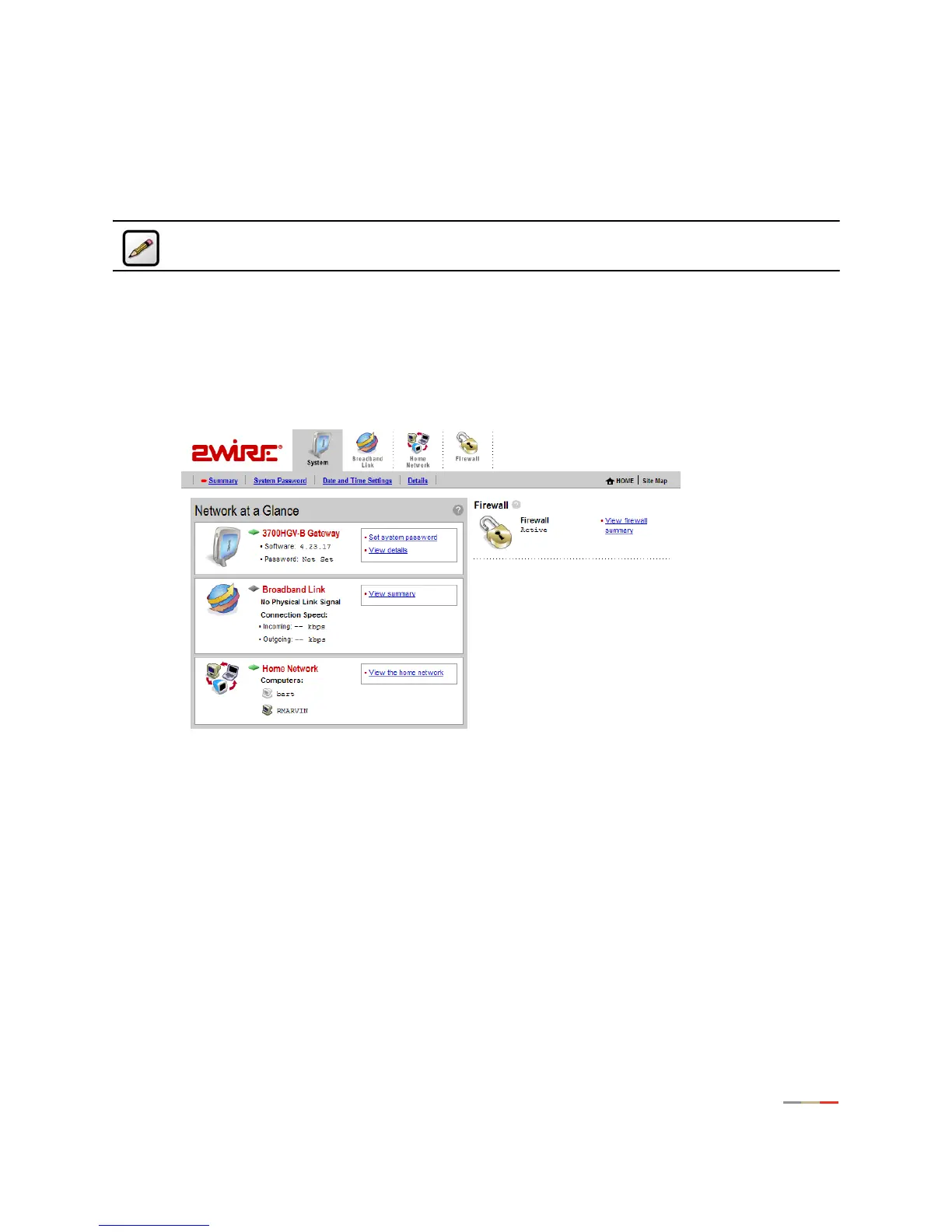 • The System area of the Network at a Glance panel displays your 2Wire gateway model name, the