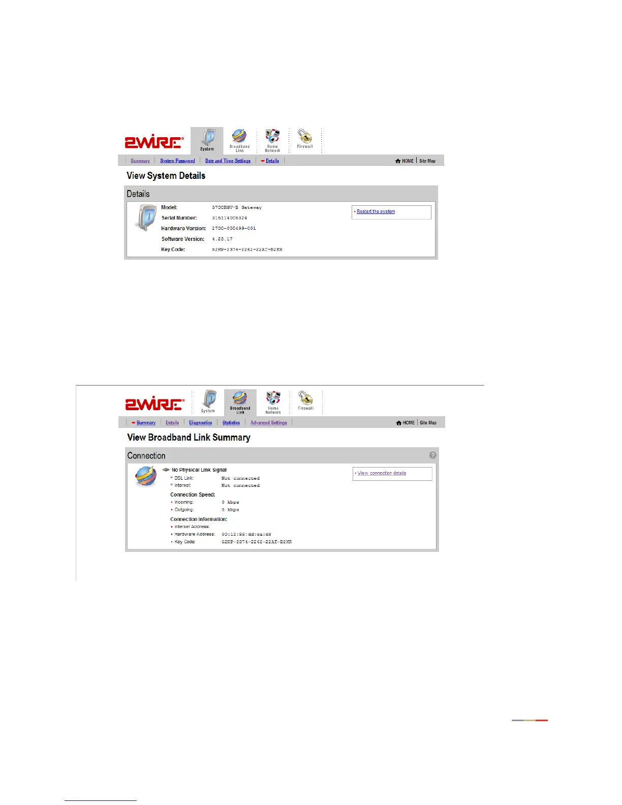 The Broadband Link Summary page provides general information about the current status of your