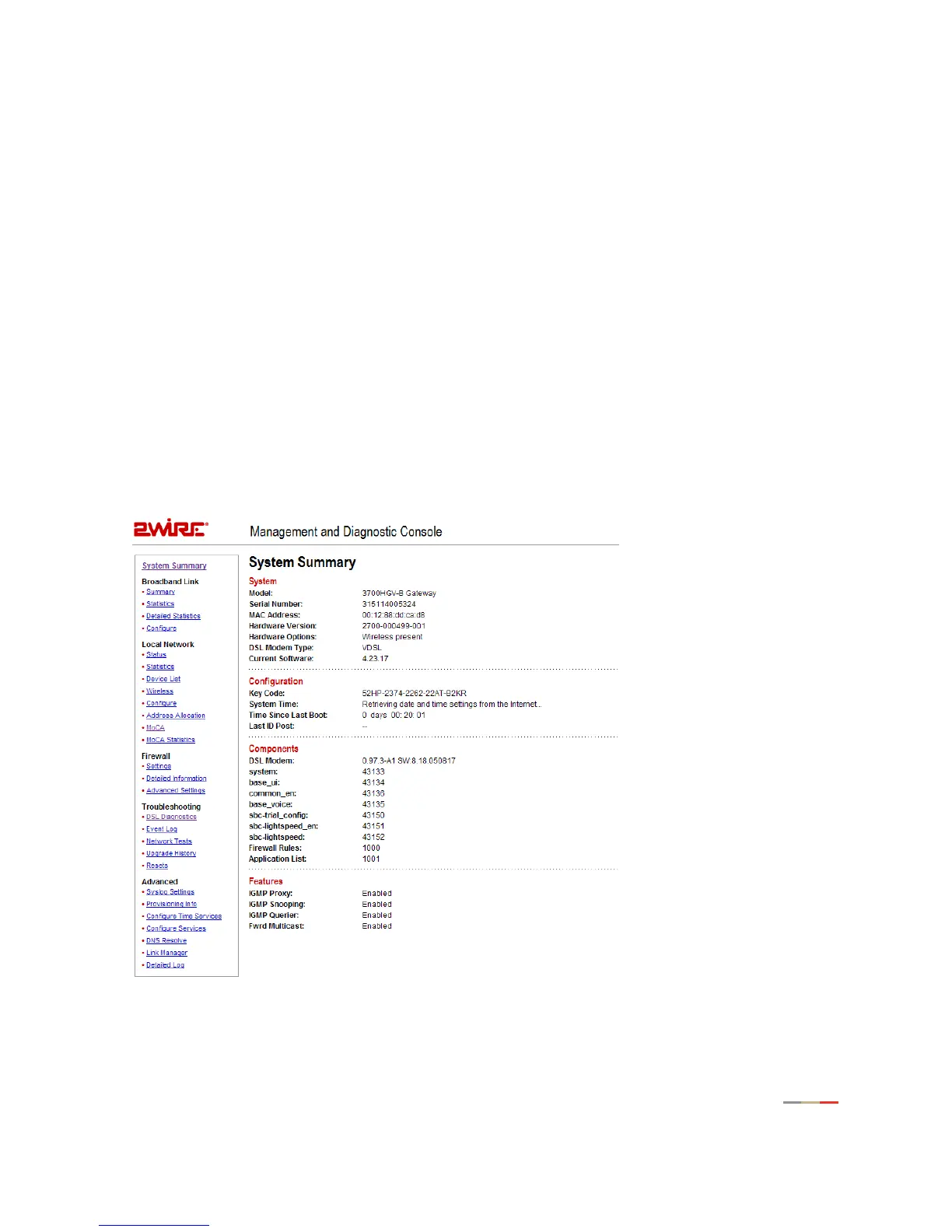 The System Summary page shows general information about the 2Wire gateway, its configuration,