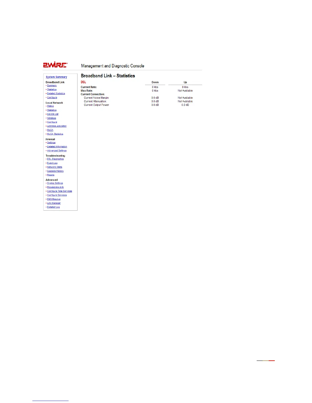 The Broadband Link - Statistics page shows statistics associated with the 2Wire gateway broadband link.