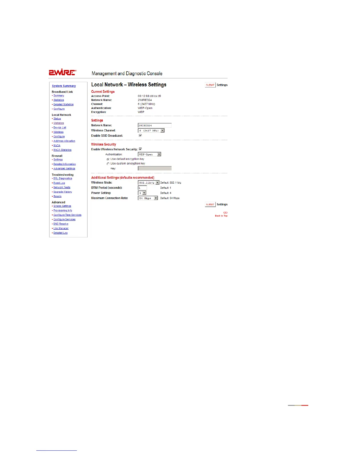 2Wire 3800HGV-B - Local Network - Wireless Settings Page