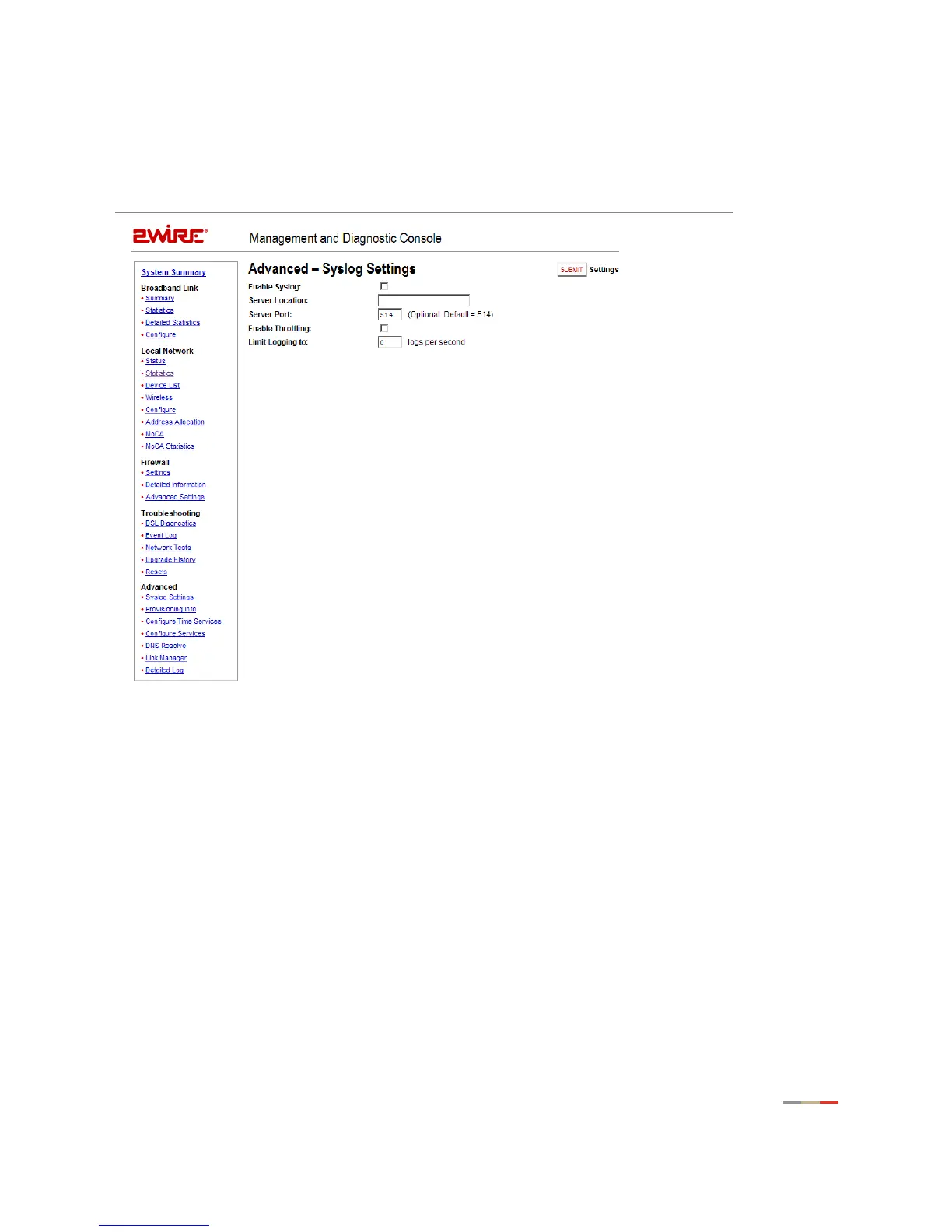 2Wire 3800HGV-B - Advanced - Syslog Settings Page