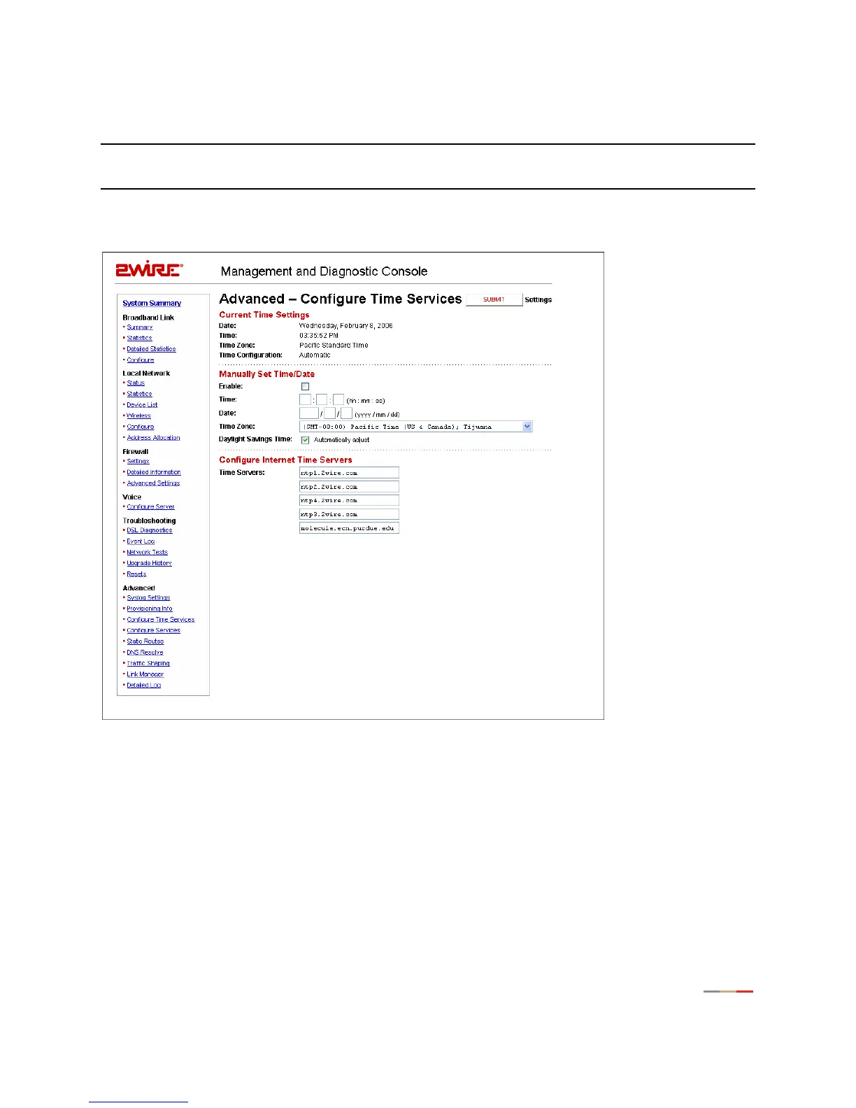 time and date are automatically displayed in the 2Wire gateway user interface. These time settings are