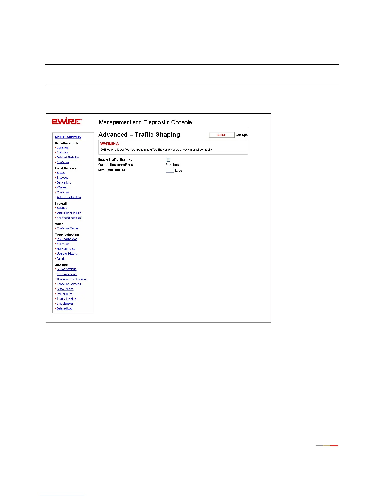 The Advanced - Traffic Shaping page allows users to change the 2Wire gateway’s maximum upstream