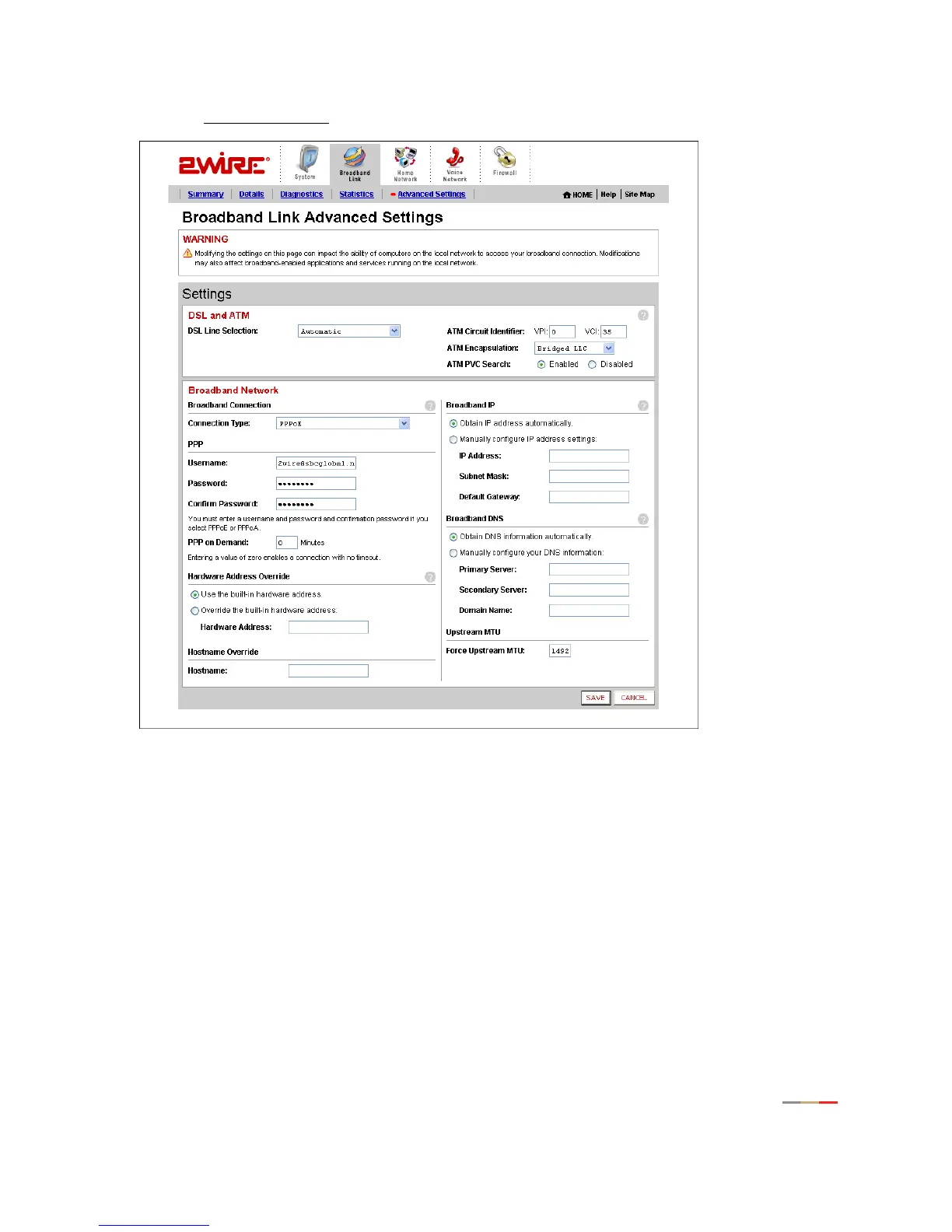 • Click the Advanced Settings link under the tab to open the Broadband Link Advanced Settings page.