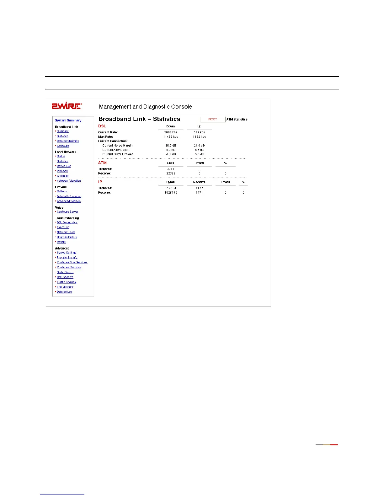 The Broadband Link - Statistics page shows statistics associated with the 2Wire gateway broadband link.
