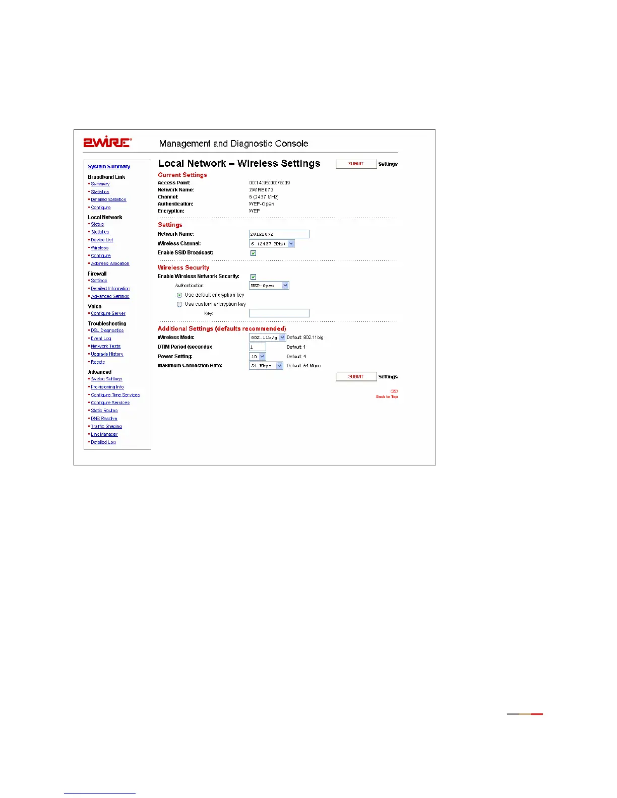 The Current Settings panel shows the 2Wire gateway’s wireless access point settings.