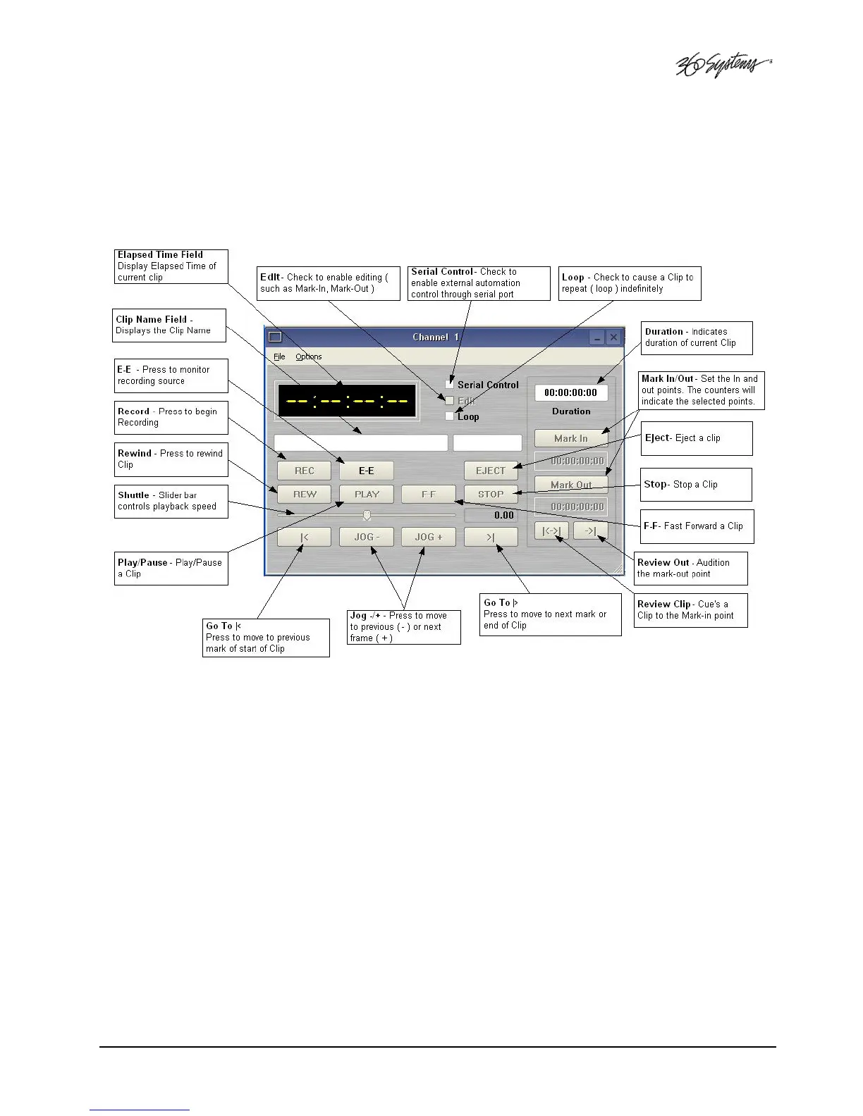 transport operations such as play, stop, record, and head/tail trimming appear in the Clip Transport