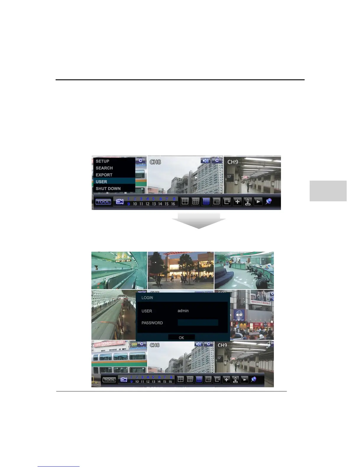 To log in, select the ‘TOOL’ button from the task bar and then select ‘USER’ as in the