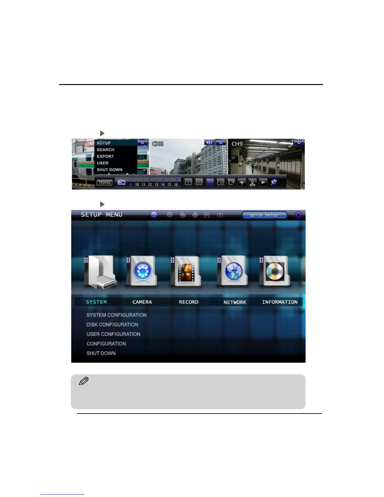 To enter the setup menu the user can press the ‘SETUP’ button on the front panel or use