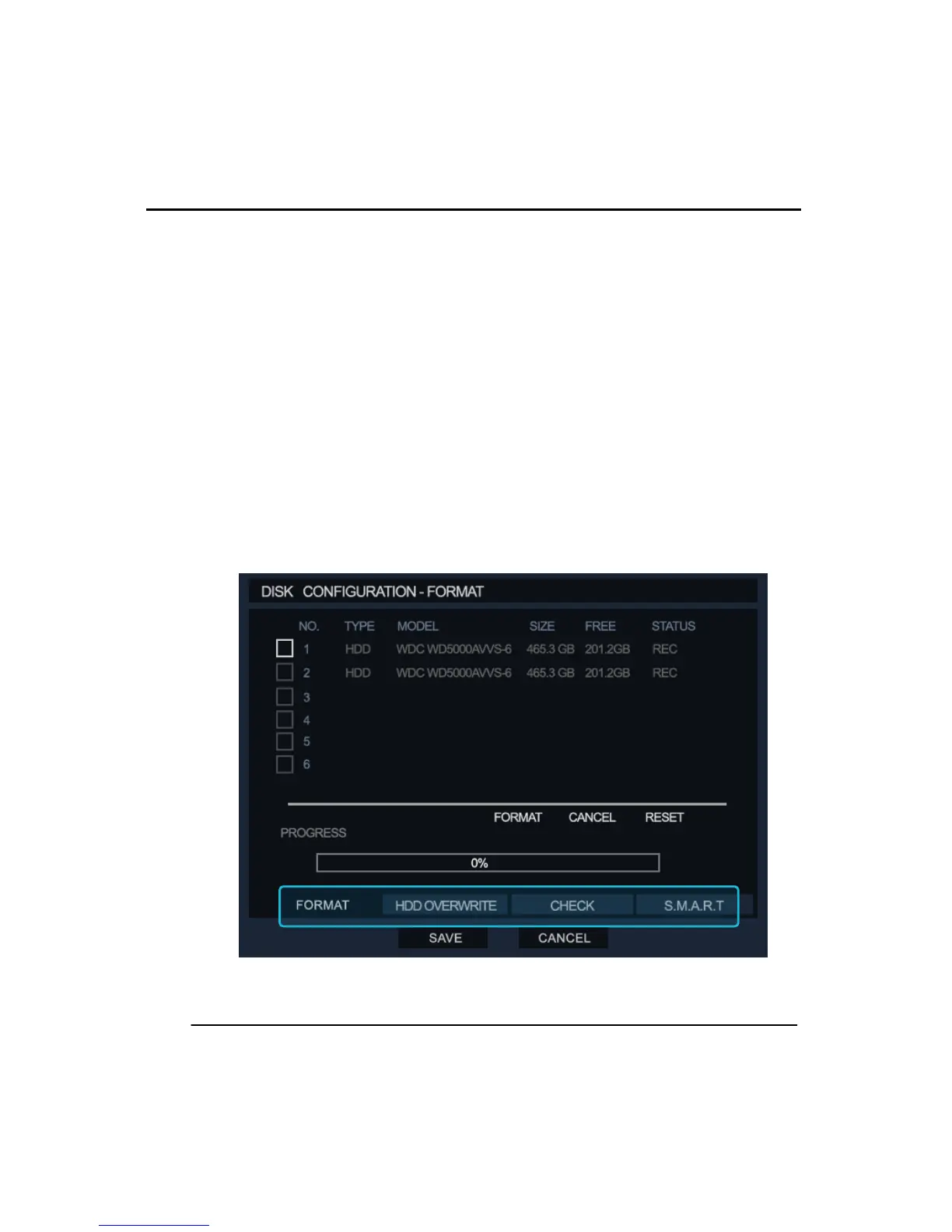 This menu allows the user to format selected HDD. Click on the box(es) required formatting