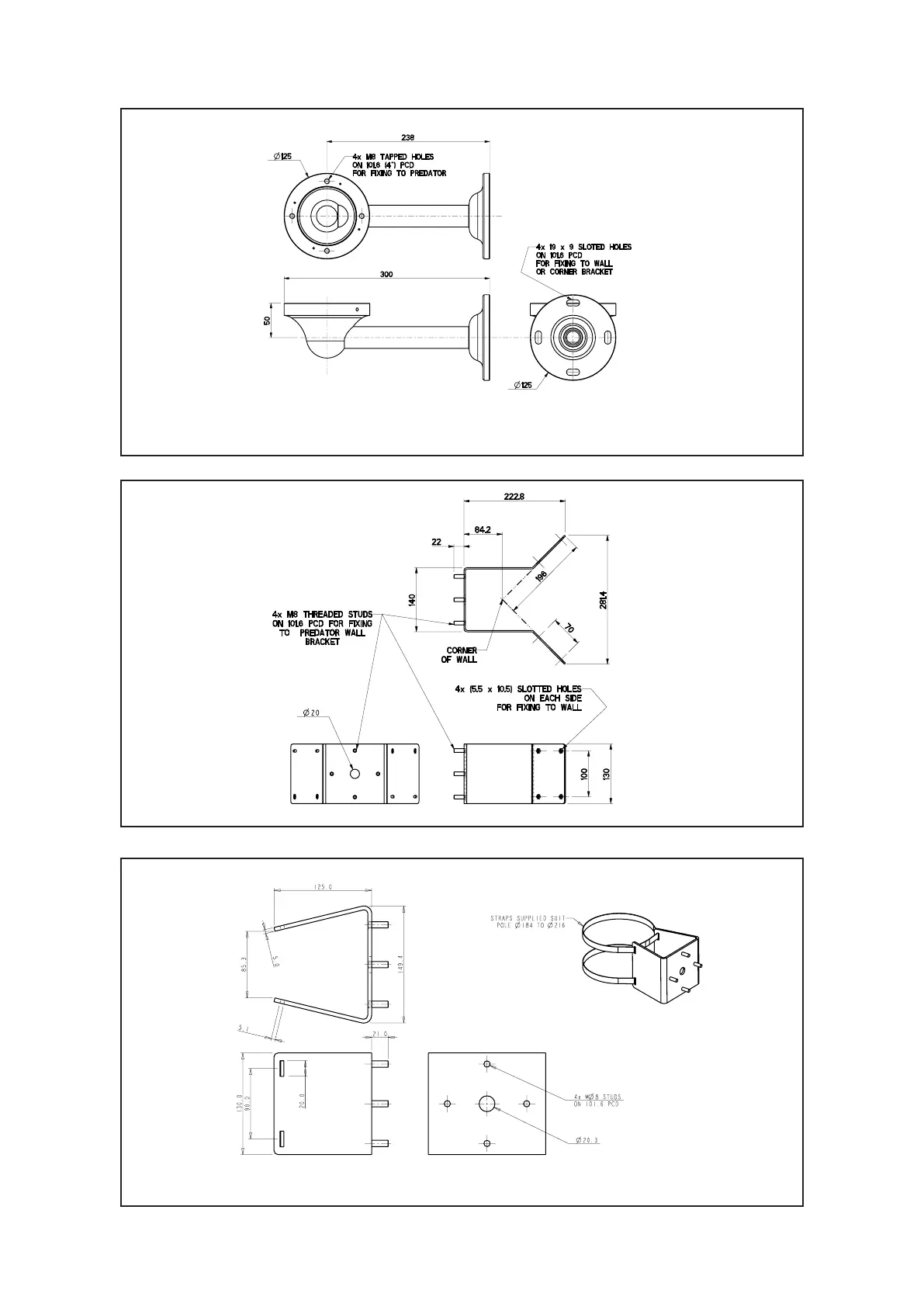 360 Vision PRED-3M - 3 Bracket Dimensional Drawing; Wall, Corner, and PMB Brackets