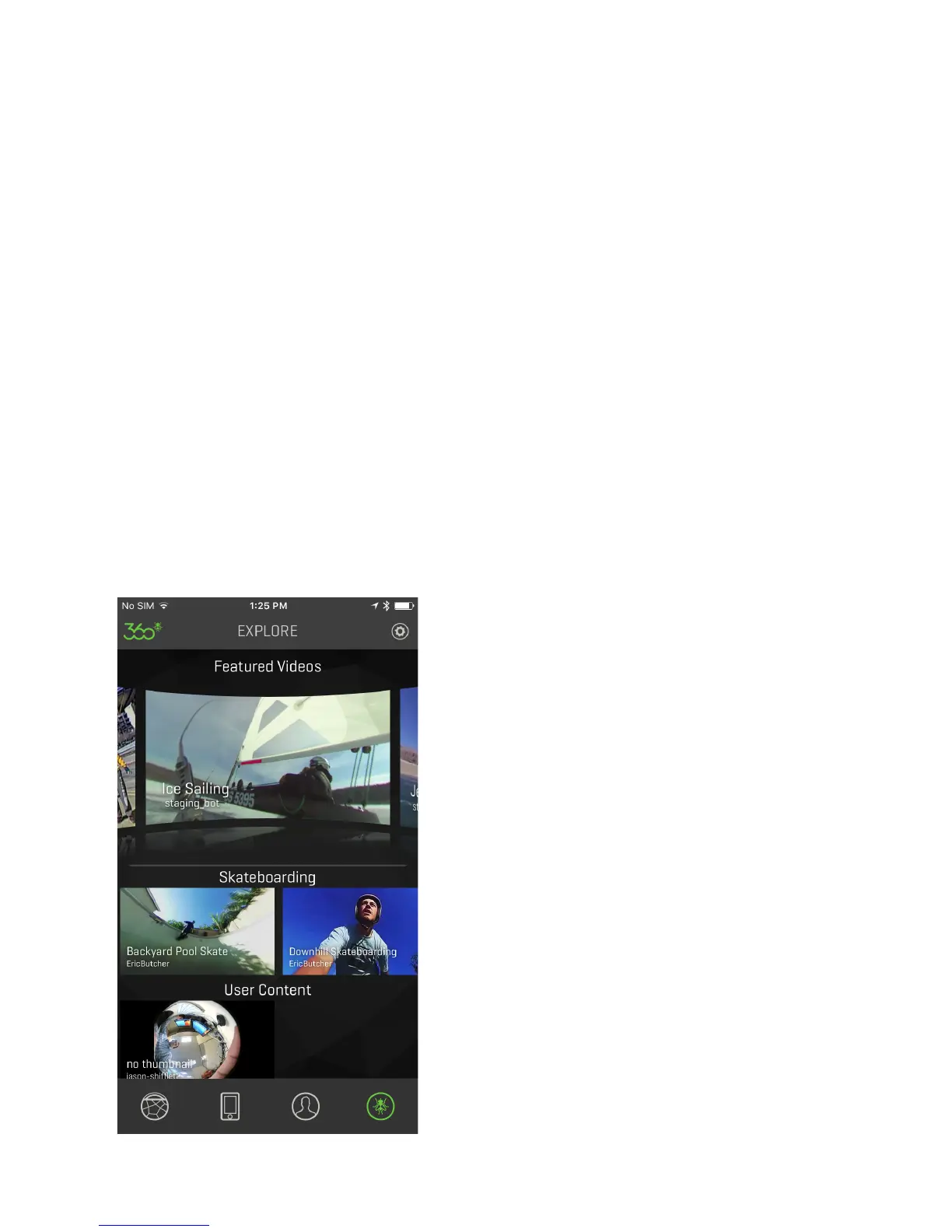 The 360fly app homepage is the hub of the 360° video world. It starts with Featured Videos where you can explore the most epic