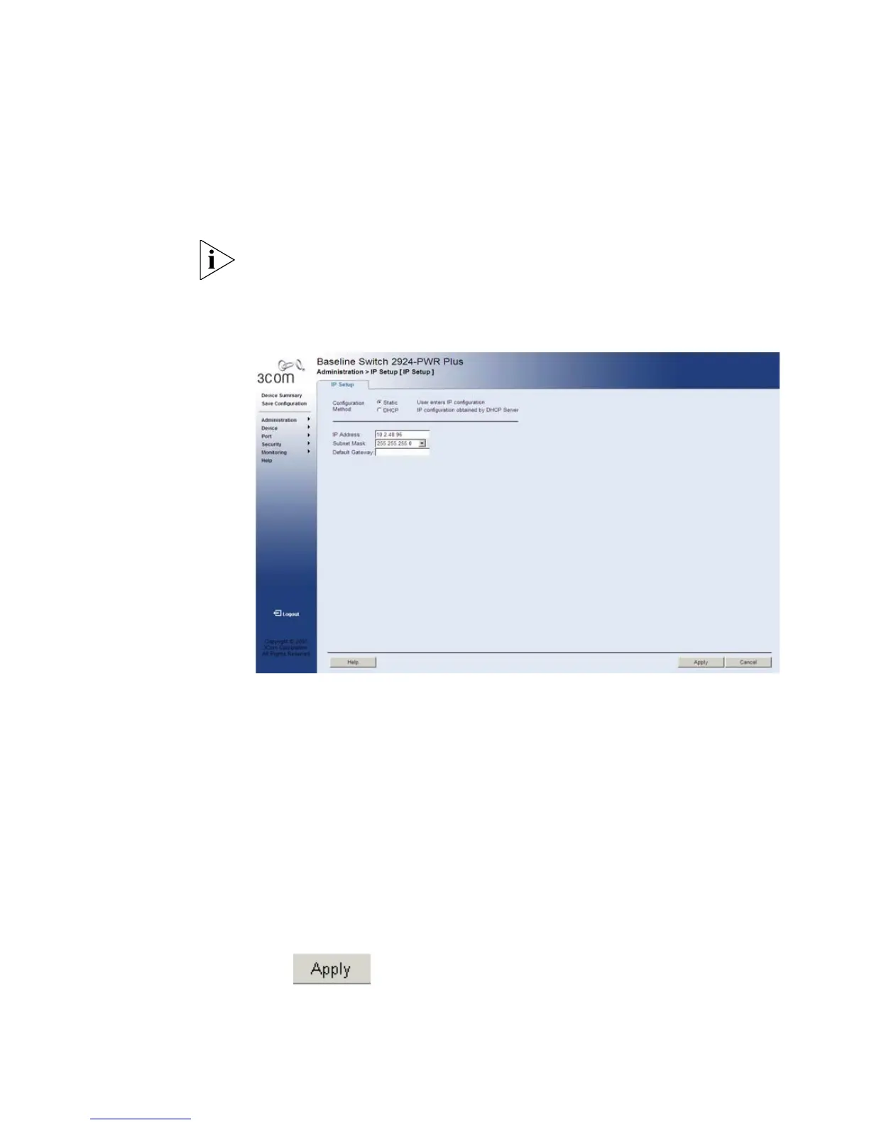 3 If Static has been selected, configure the IP Address, Subnet Mask and