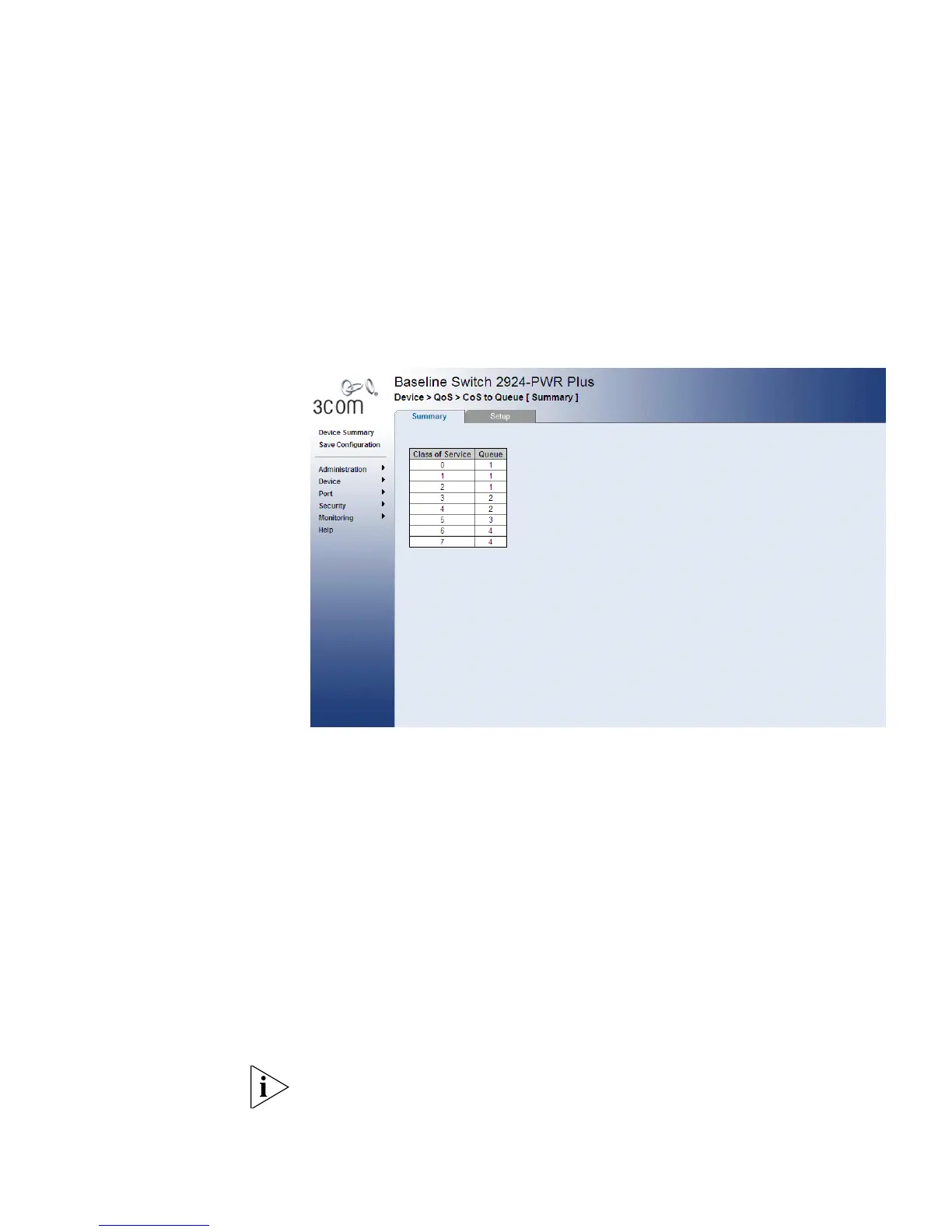 The CoS to Queue Summary Page contains a table that displays the CoS