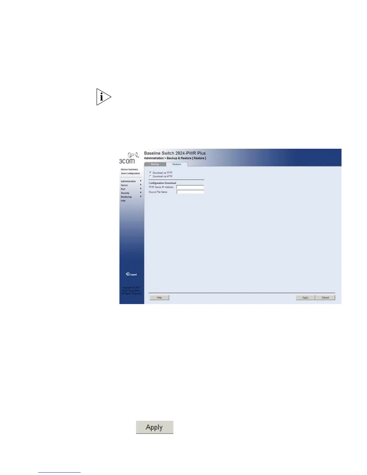Restoring Files The Restore Page restores files from the TFTP or HTTP server.