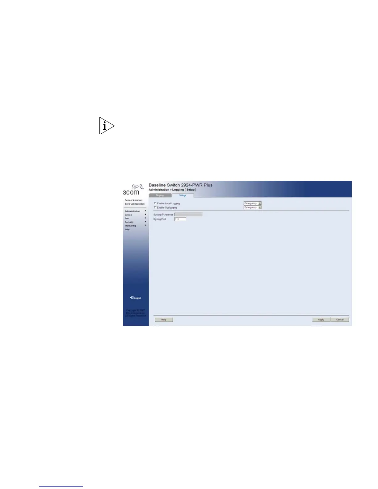 1 Click Administration > Logging > Setup. The Logging Setup Page