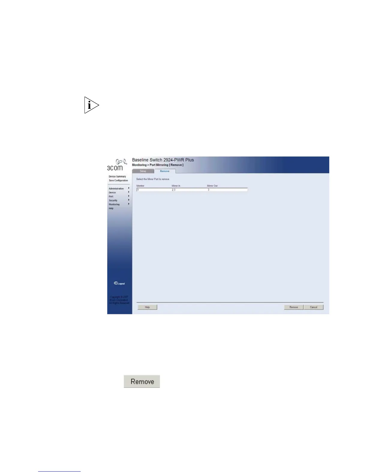 The Port Mirroring Remove Page permits the network manager to