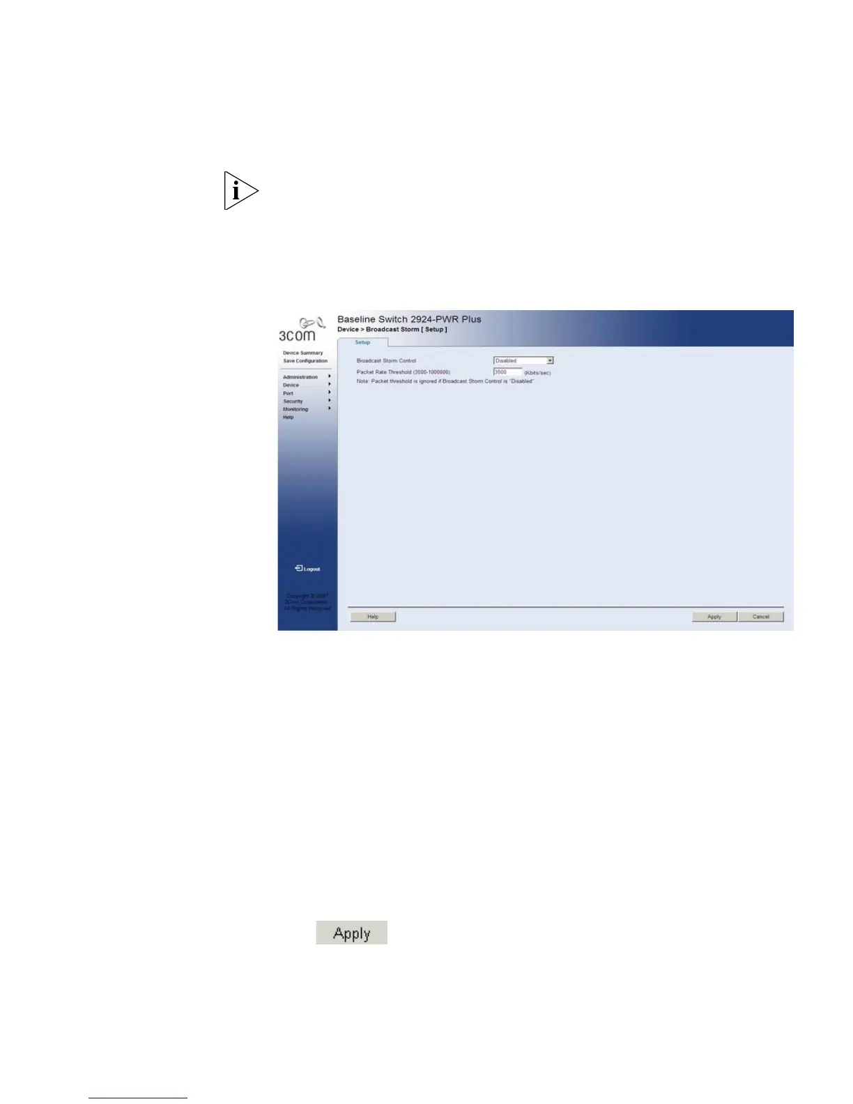 1 Click Device > Broadcast Storm > Setup. The Broadcast Storm Setup