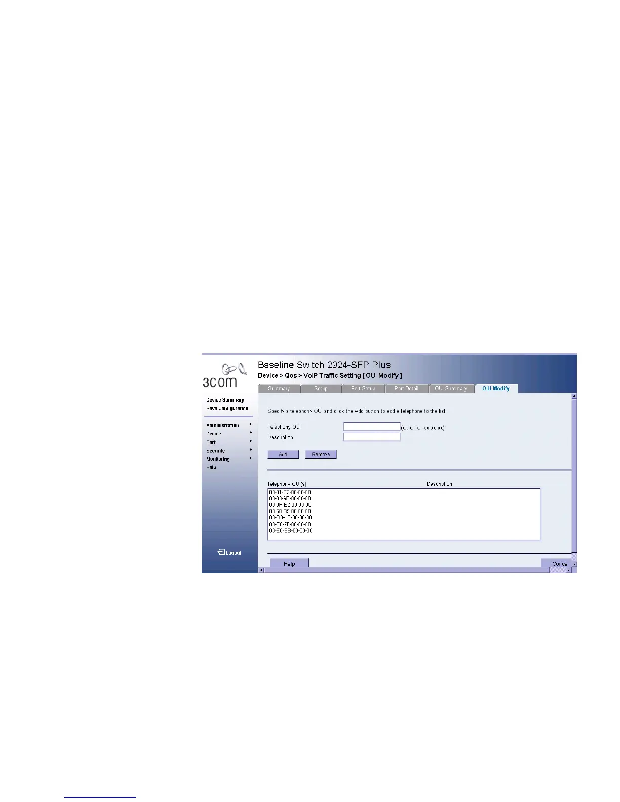 The Voice VLAN OUI Modify Page allows network administrators to add