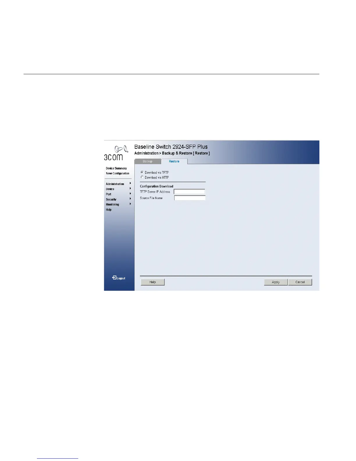 Restoring Files The Restore Page restores files from the TFTP or HTTP server.