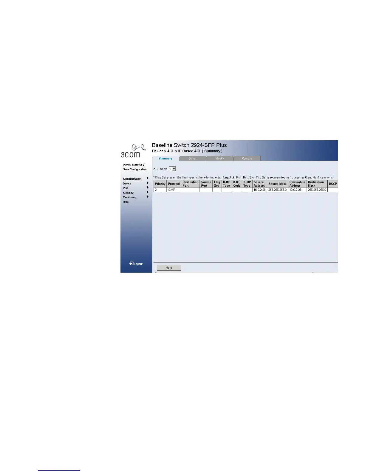 The IP Based ACL Summary Page displays information regarding IP Based