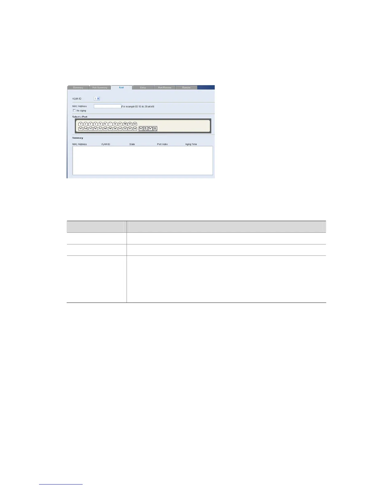 The Address Table Add Page allows the network manager to assign MAC addresses to ports with