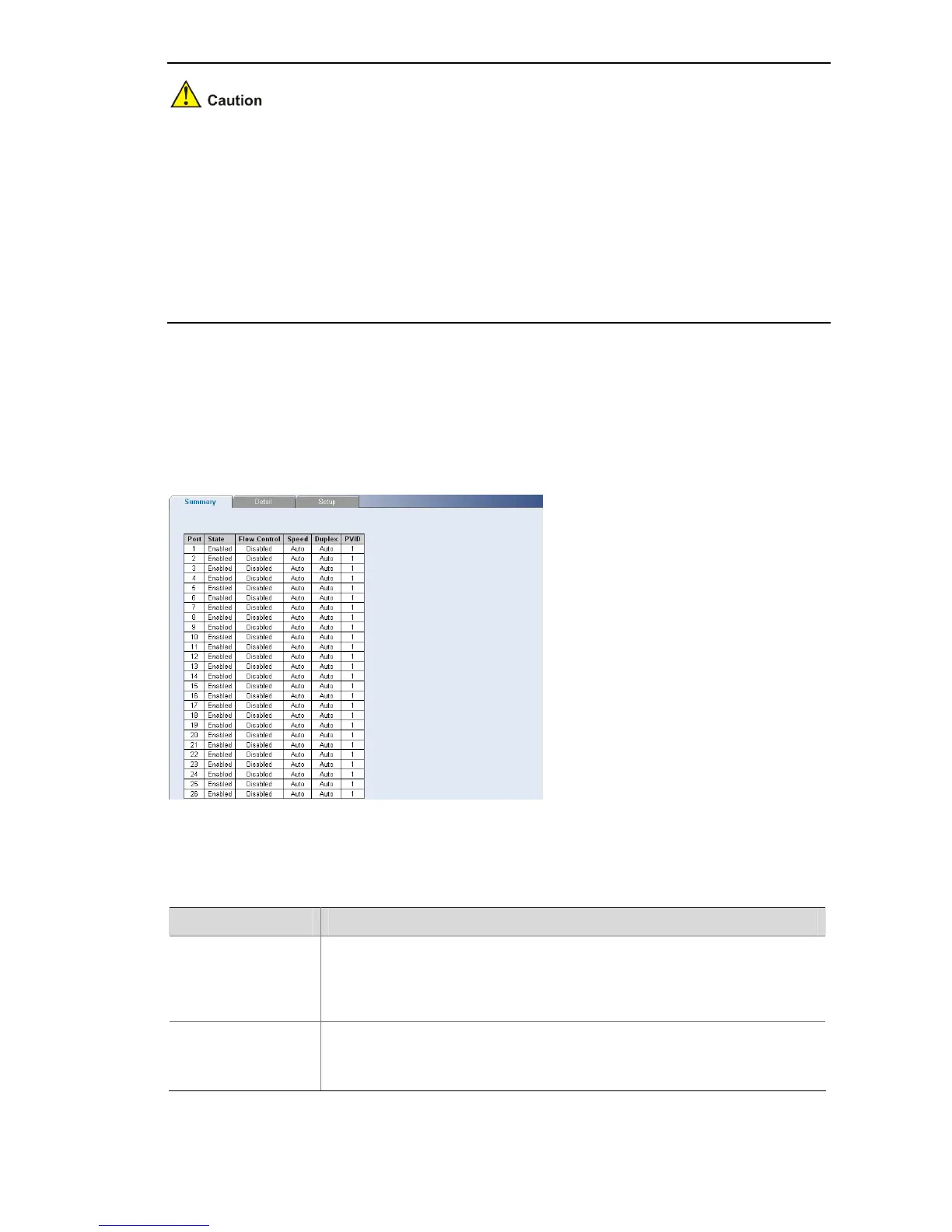 The Port Summary Page permits the network manager to view the current configuration for all the ports.