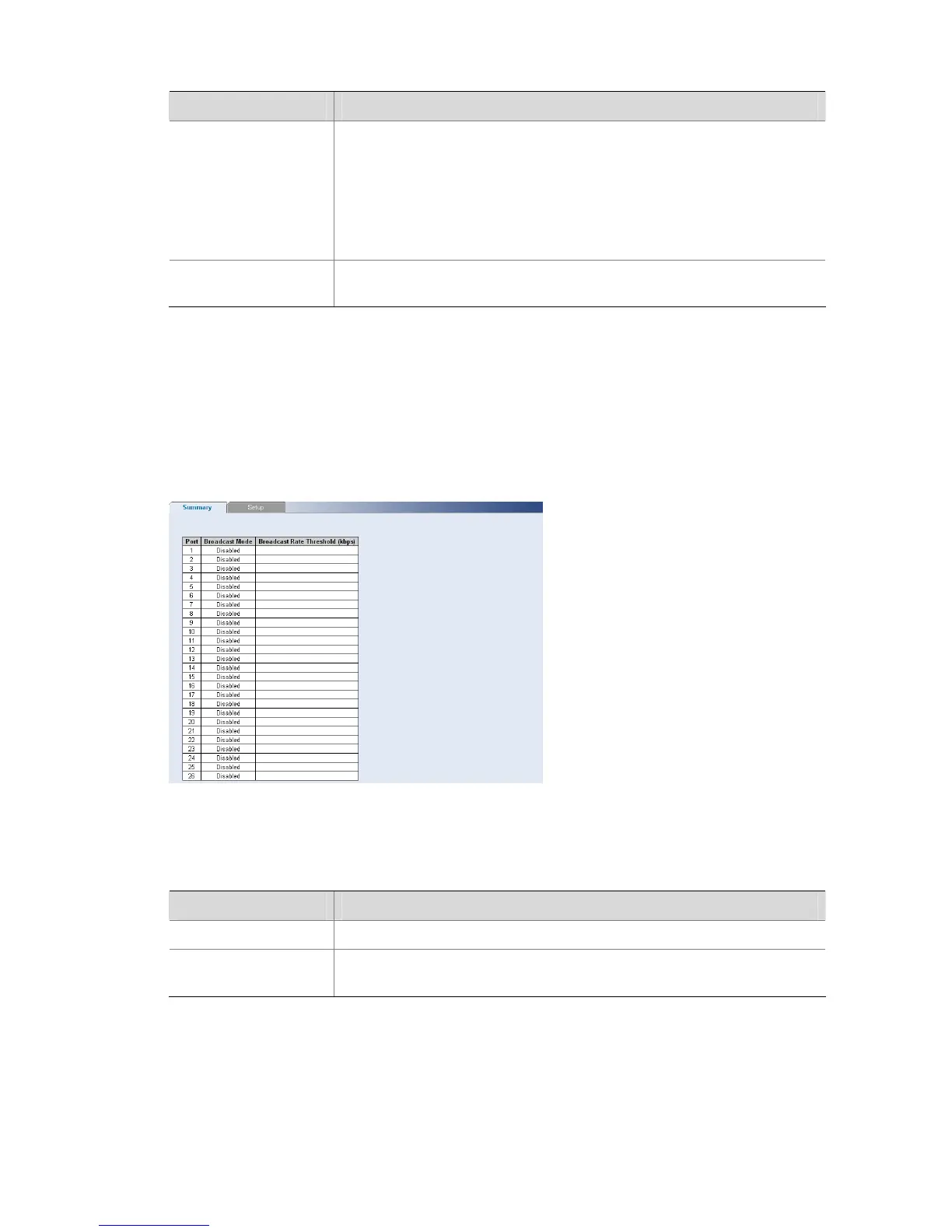 The Broadcast Storm Summary Page displays the current broadcast storm control parameters for all