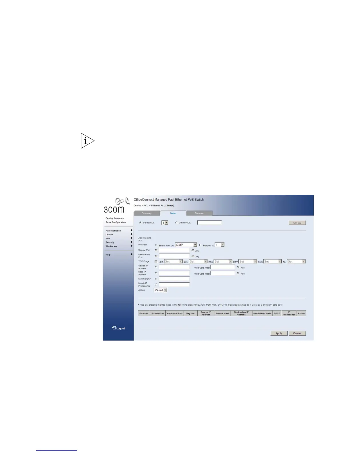 Click Device > ACL > IP Based ACL > Setup. The IP Based ACL Setup