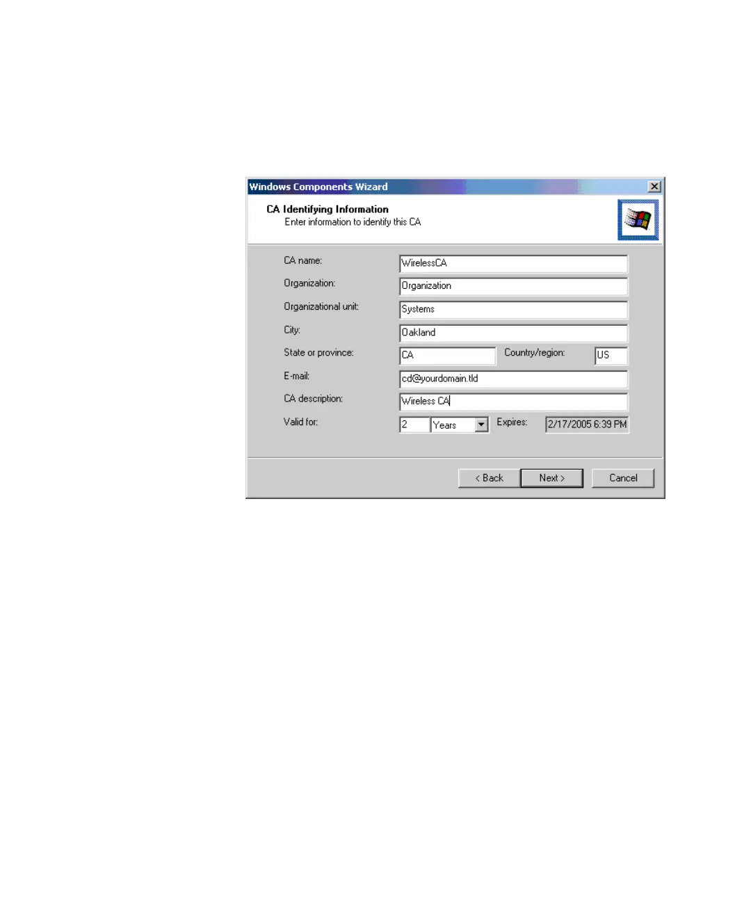8 Click Next to use the CA’s default configuration. Windows setup displays