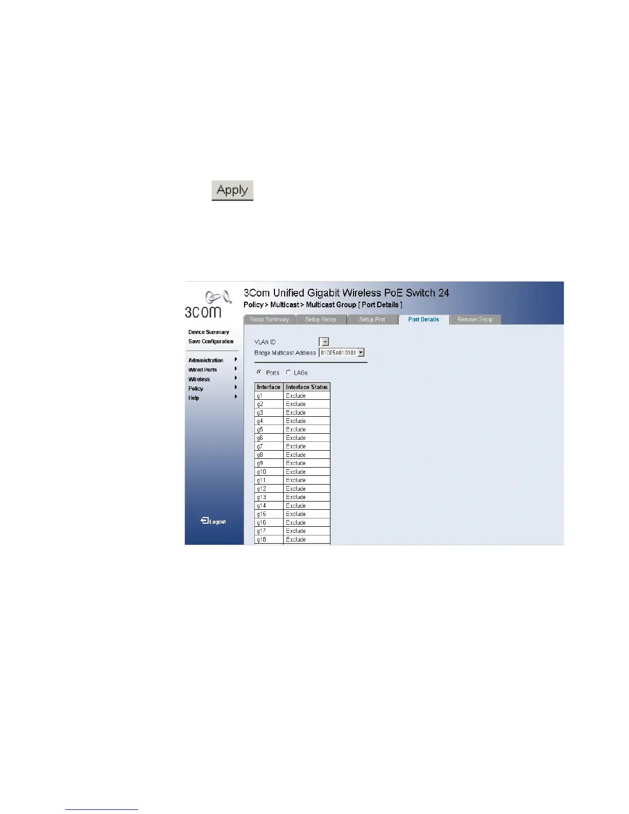 1 Click Policy > Multicast > Multicast Group > Port Details. The