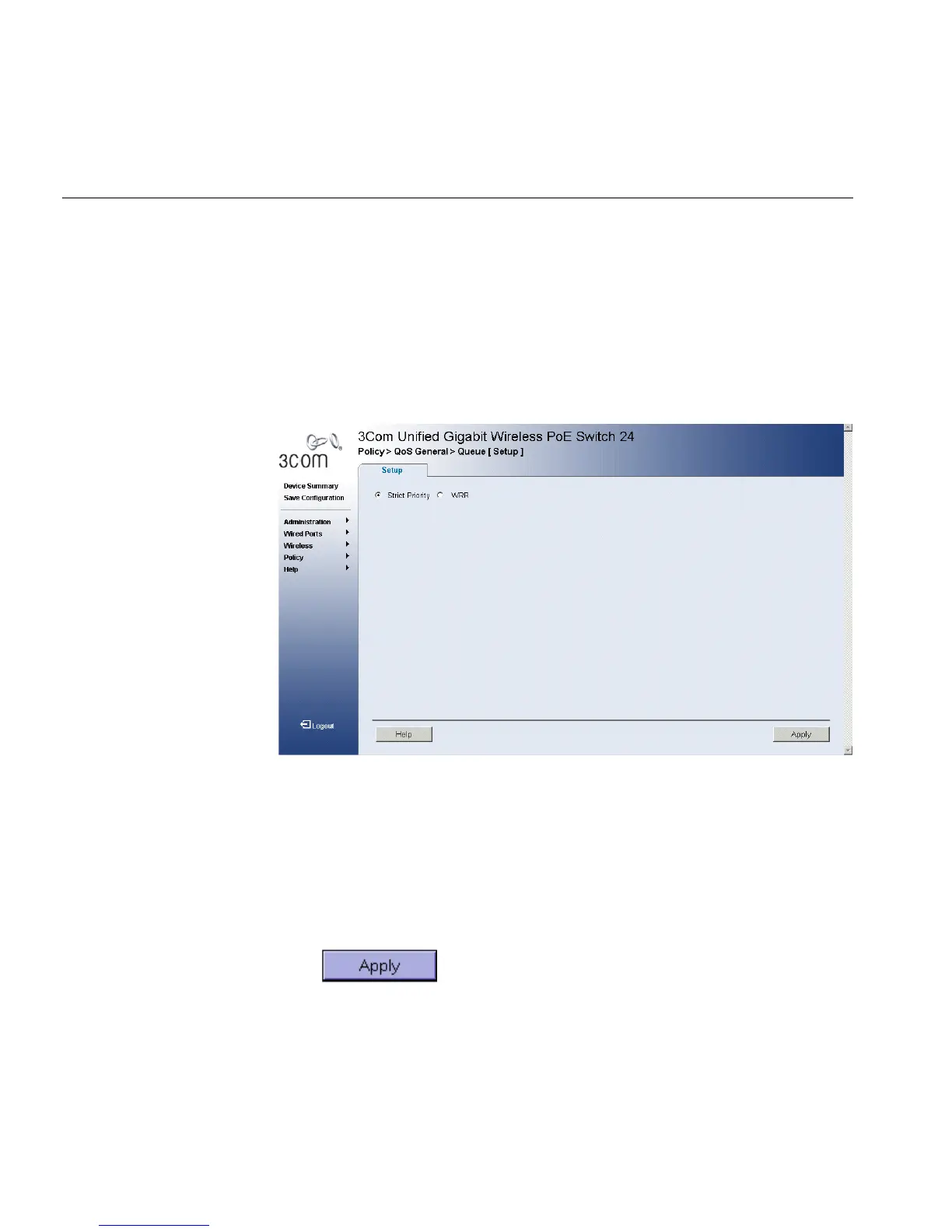 1 Click Policy > QoS General > Queue > Setup. The Queue Setup Page