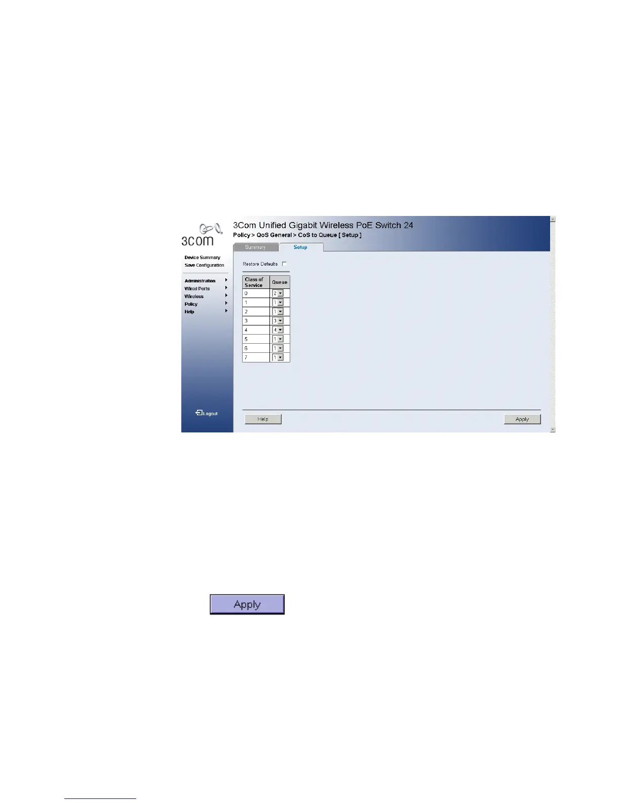 1 Click Policy > QoS General > CoS to Queue > Setup. The CoS to