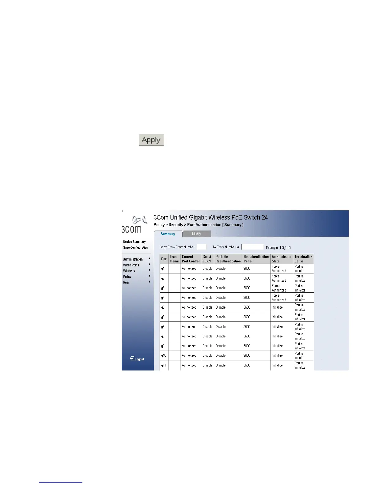 1 Click Policy > Security > Port Authentication > Summary. The Port