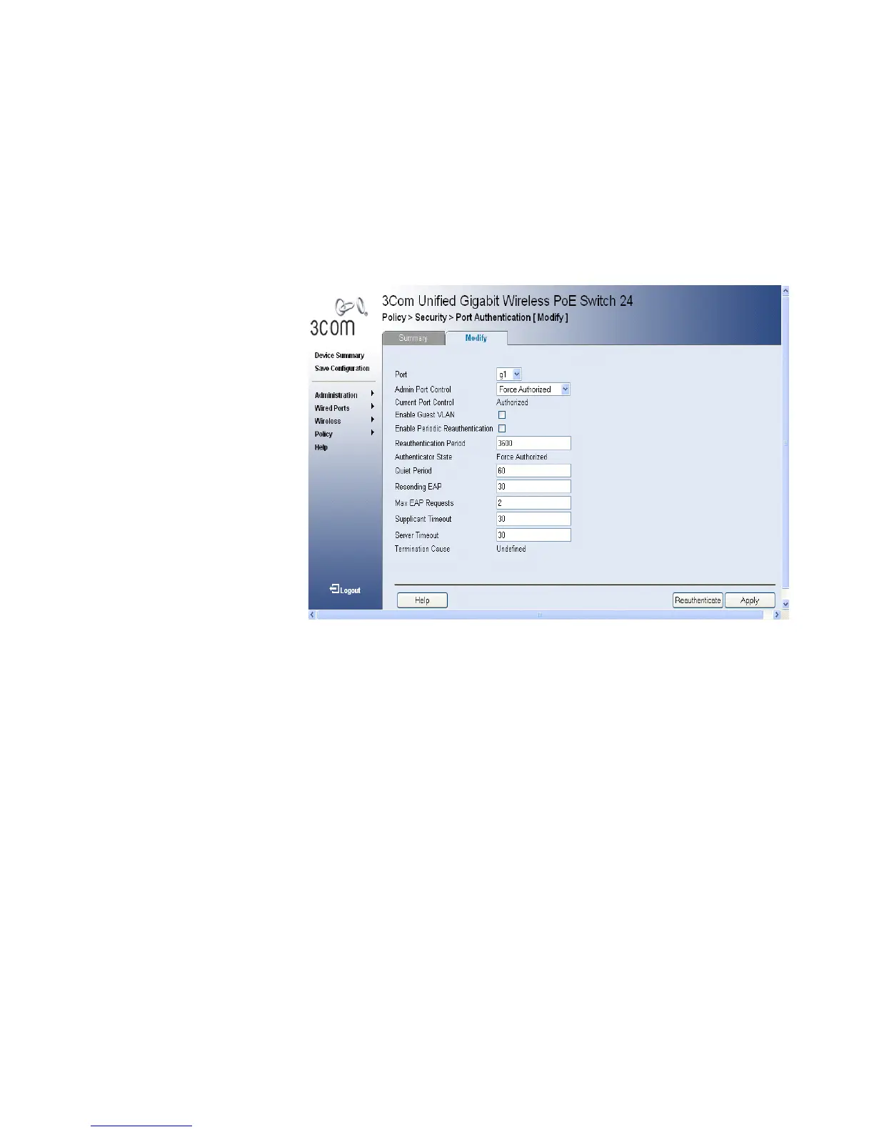 1 Click Policy > Security > Port Authentication > Modify. The Port