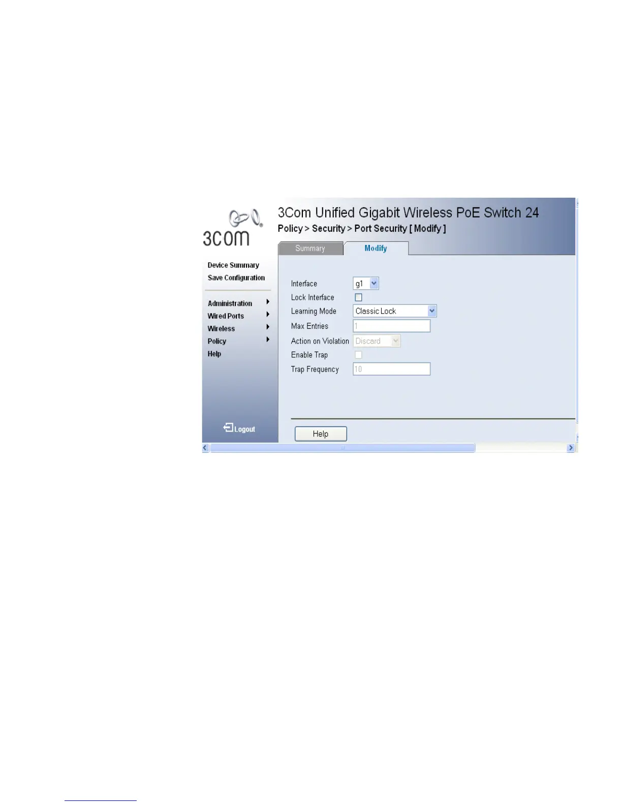 1 Click Policy > Security > Port Security > Modify. The Port Security