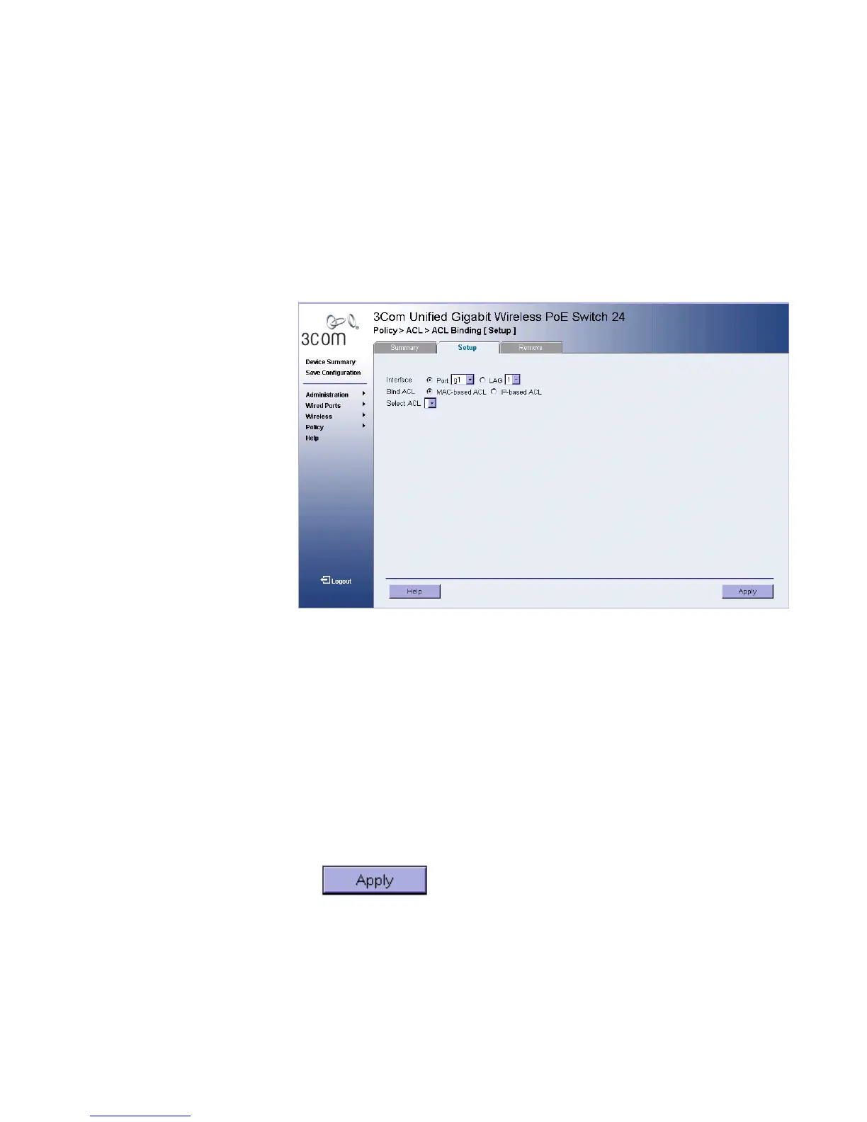 1 Click Policy > ACL > ACL Binding > Binding Setup. The ACL Binding