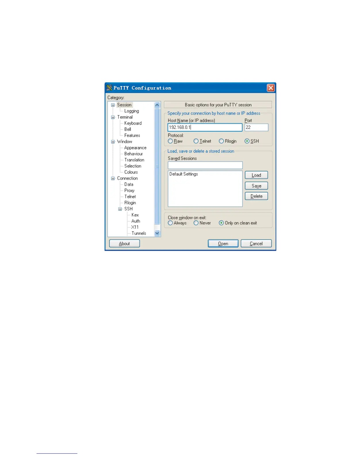 1 Run PuTTY.exe to enter the following configuration interface.