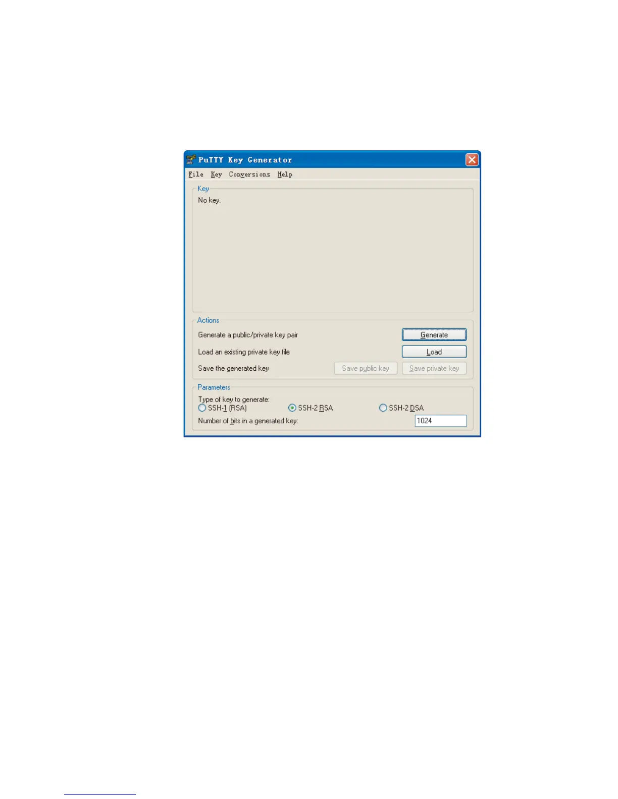 # Generate an RSA key pair, taking PuTTYGen as an example.